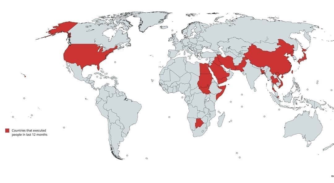 執行死刑的國家:如上圖,紅色區是在2015年,仍把處決視為正常的國家,雖然仍有處決不公的地方。