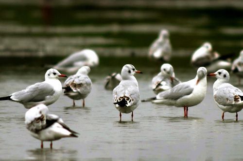 每次看到红嘴鸥都多达3、40隻以上,群聚在水田中,或是上百隻集结在一、两块鱼塭中活动,是种会靠近人烟的鸥鸟,聚集在一起时常常栖息不动,很少飞进飞出, 直到黄昏准备过夜才群飞往港口附近海域或外海的沙洲 。