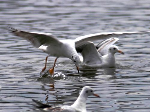 浮水中的红嘴鸥通常会以「小幅度连续跃进方式」跃入水中觅食小鱼小虾,族群在水面上会各自散开,也会成群结队,非常会运用「觅食策酪」;牠们甚至会在寒流後去鱼塭寻找水面冻僵了的鱼尸,难怪在度冬区都吃得饱饱的!