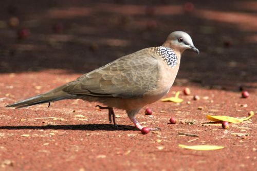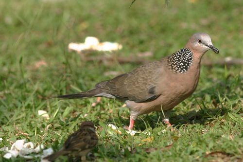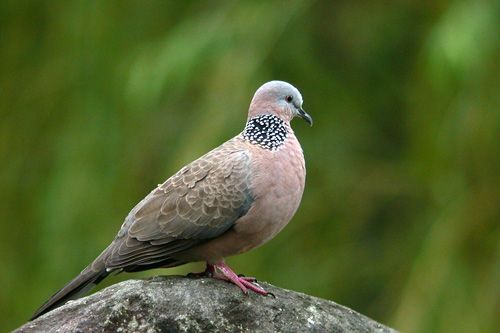 可爱的珠颈斑鸠羽色朴素,圆胖的身躯不如鸽子大隻,只有30公分,雌雄体色稍有不同,公鸟颜色对比明显些,母的较暗淡,辨认只能靠经验。此外,牠拥有尖端钩状,又细又黑的鸽形嘴,当然看来像鸽子。